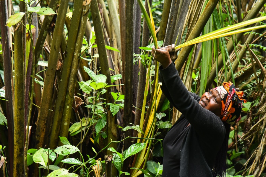 A woman collects raffia leaves before extracting their fibers to make Ndop fabric in Baham, Cameroon, April 11, 2023. (Xinhua/Kepseu)