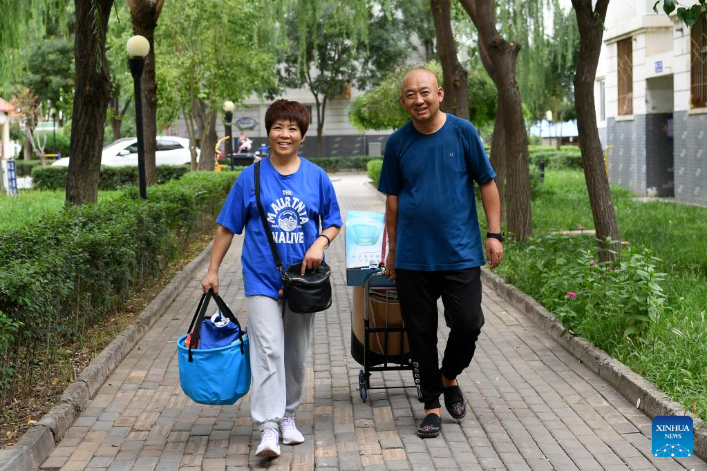 Fan Zhi (R) and Chen Zeying are on the way to provide bathing services for disabled elderly in Yinchuan, northwest China's Ningxia Hui Autonomous Region, Aug. 19, 2022. (Xinhua)