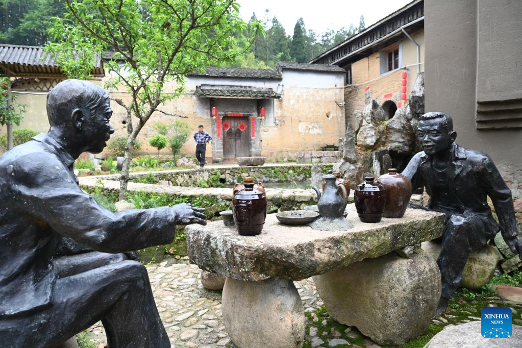 This photo taken on April 20, 2023 shows sculptures in the Beiqian Village of Daixi Township in Pingnan County, southeast China's Fujian Province. Beiqian Village created a multi-format industry based on the integration of the resources of ancient village, folk culture and yellow wine culture.