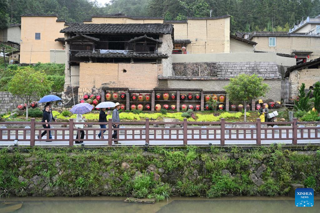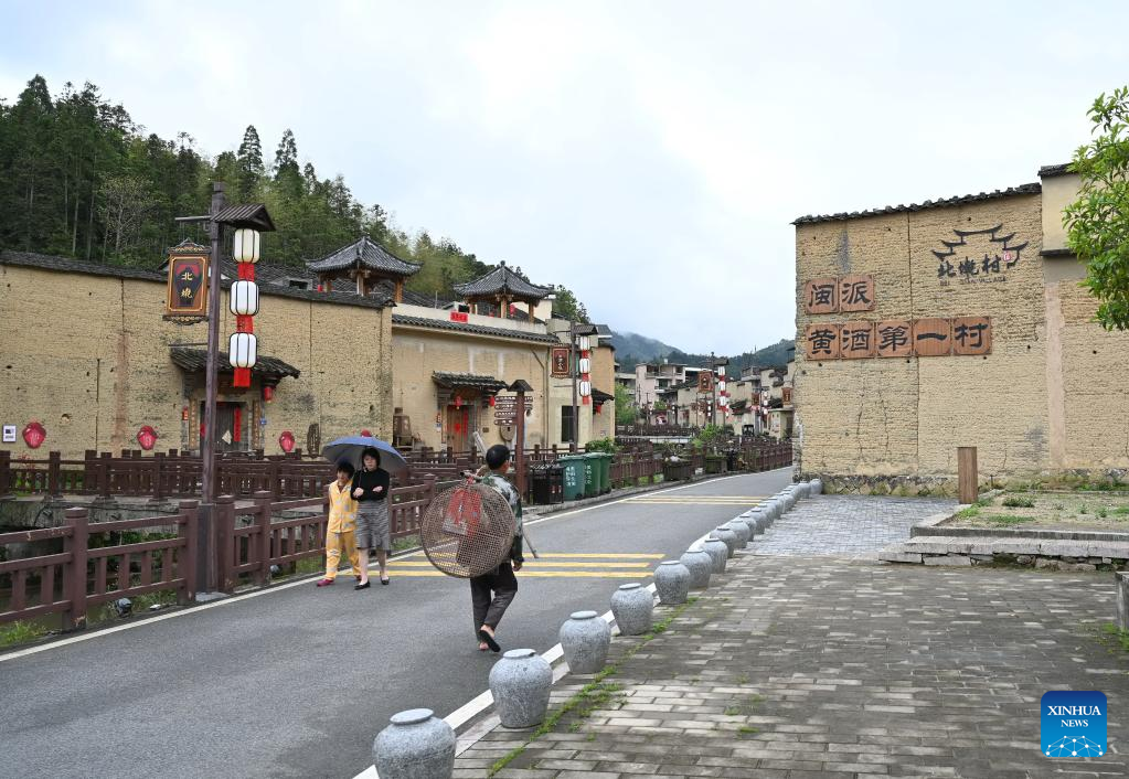 Tourists visit Beiqian Village of Daixi Township in Pingnan County, southeast China's Fujian Province, on April 20, 2023. Beiqian Village created a multi-format industry based on the integration of the resources of ancient village, folk culture and yellow wine culture.