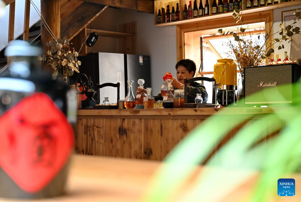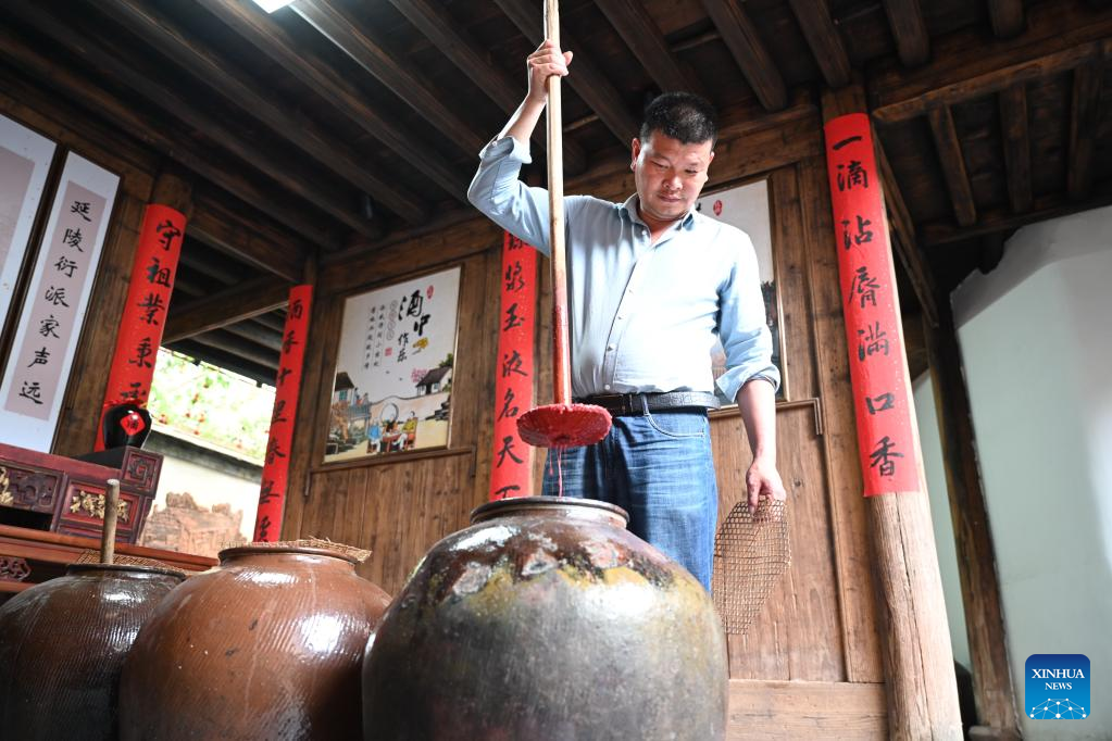 A staff member of a yellow wine shop prepares local yellow wine for tourists in Beiqian Village of Daixi Township in Pingnan County, southeast China's Fujian Province, on April 20, 2023. Beiqian Village created a multi-format industry based on the integration of the resources of ancient village, folk culture and yellow wine culture.
