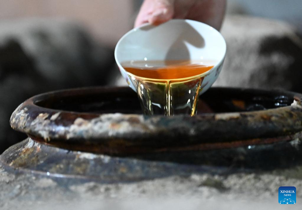 Villager Wu Shandi shows the brewing process at a yellow wine experience hall at Beiqian Village of Daixi Township in Pingnan County, southeast China's Fujian Province, on April 20, 2023. Beiqian Village created a multi-format industry based on the integration of the resources of ancient village, folk culture and yellow wine culture.