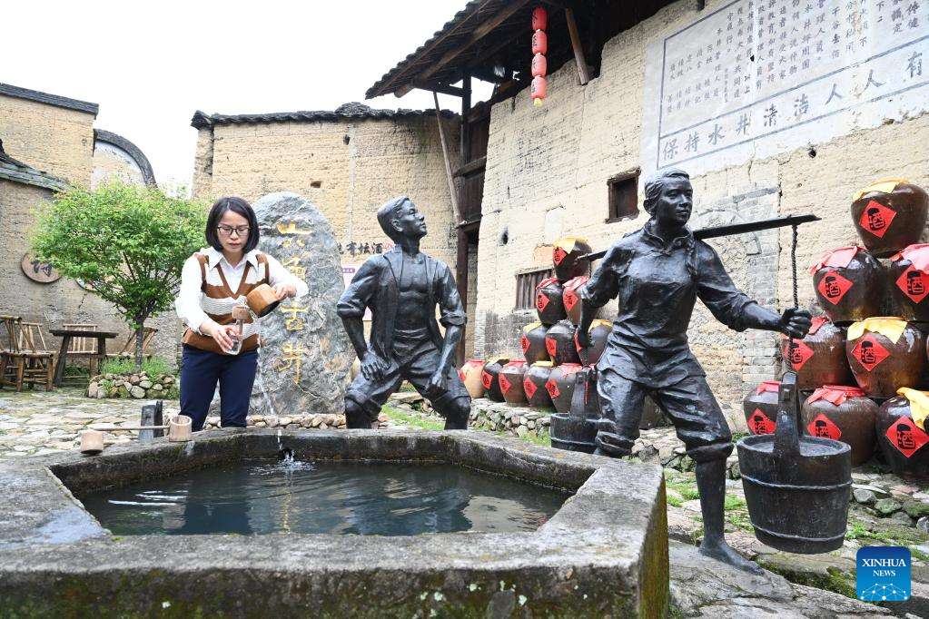 A tourist takes water for drinking from an ancient well that can be used for wine making at Beiqian Village of Daixi Township in Pingnan County, southeast China's Fujian Province, on April 20, 2023. Beiqian Village created a multi-format industry based on the integration of the resources of ancient village, folk culture and yellow wine culture.