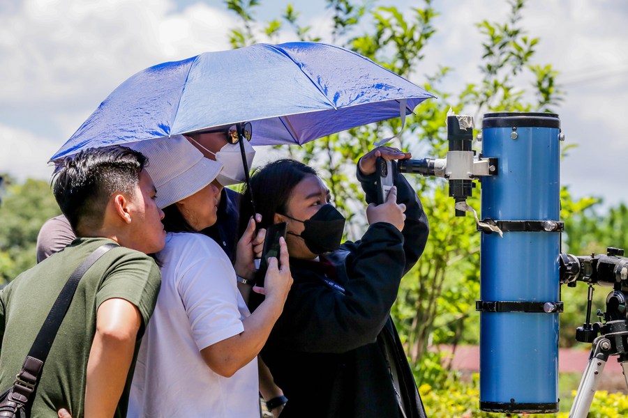 QUEZON CITY, the Philippines, April 21 (Xinhua) -- It was lucky for people to witness a partial solar eclipse in Quezon City, the Philippines, through telescopes or special sunglasses.