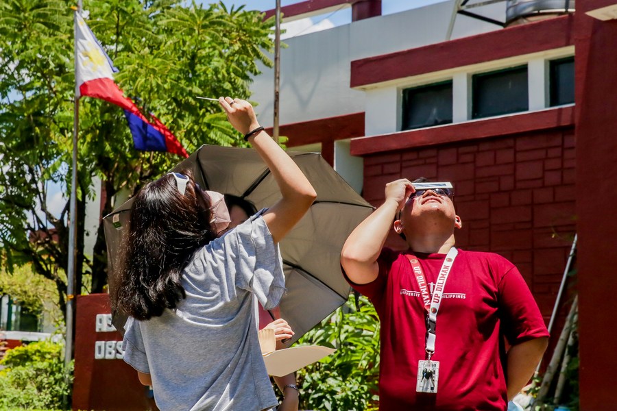 Students use special sunglasses to look at a partial solar eclipse at the University of the Philippines in Quezon City, the Philippines on April 20, 2023. (Xinhua/Rouelle Umali)