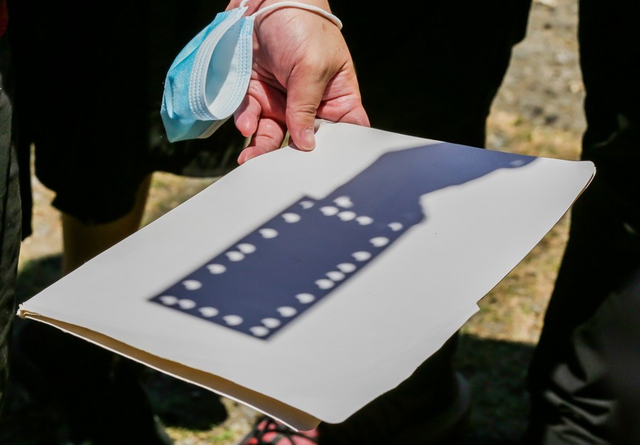 A partial solar eclipse is projected on a cardboard through pinholes at the University of the Philippines in Quezon City, the Philippines on April 20, 2023. (Xinhua/Rouelle Umali)