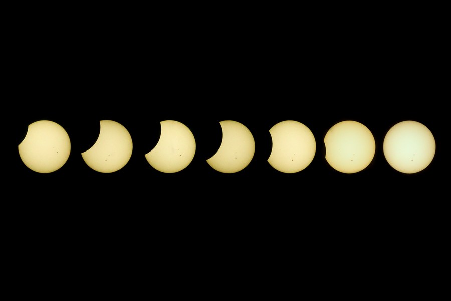 This combined photo shows the process of a partial solar eclipse observed at the University of the Philippines in Quezon City, the Philippines on April 20, 2023. (Xinhua/Rouelle Umali)