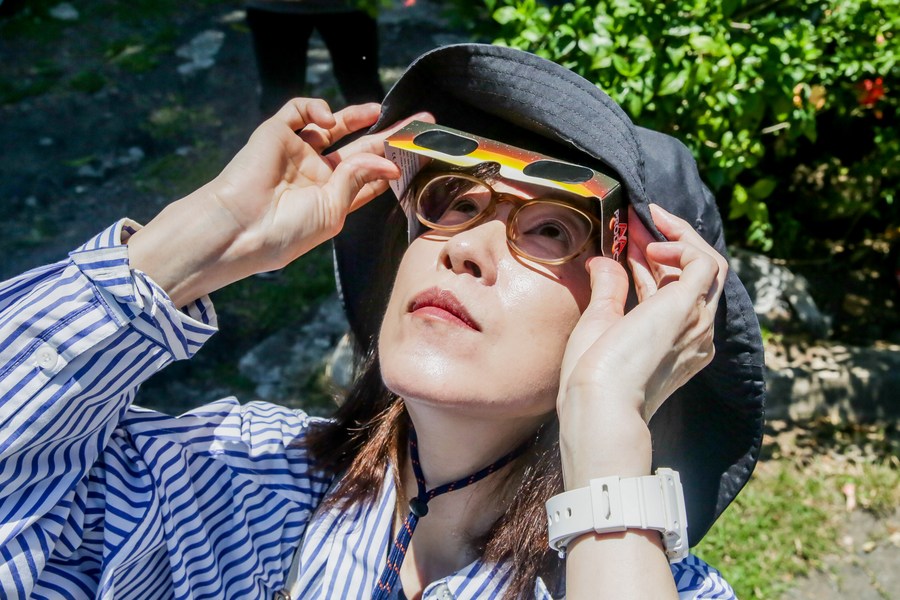 A woman uses a special sunglass to watch a partial solar eclipse at the University of the Philippines in Quezon City, the Philippines on April 20, 2023. (Xinhua/Rouelle Umali)
