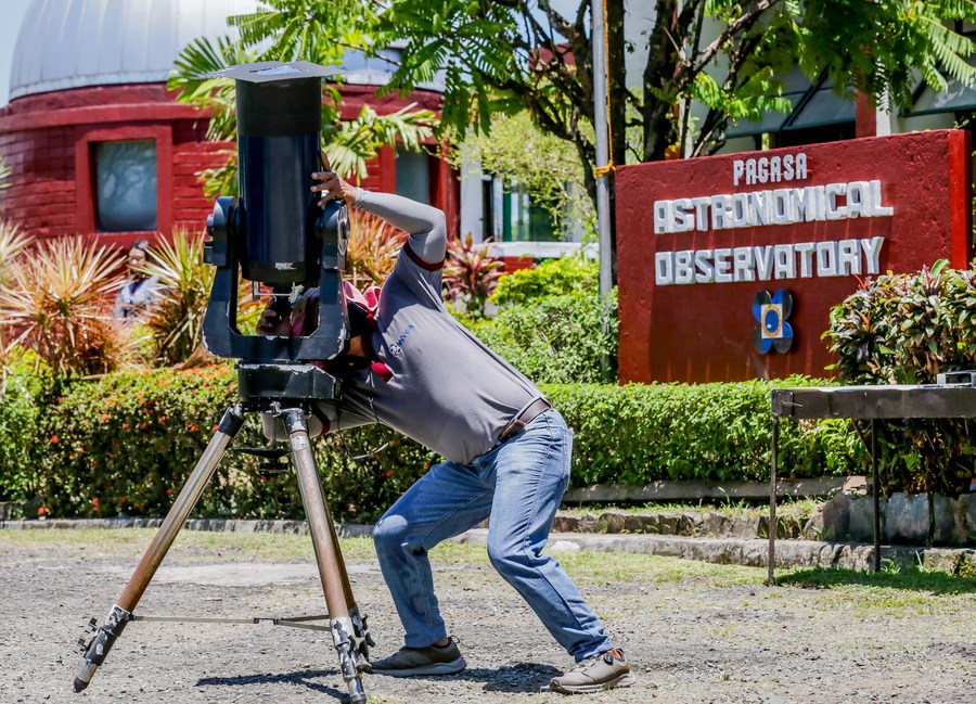A man watches a partial solar eclipse through a telescope at the University of the Philippines in Quezon City, the Philippines on April 20, 2023. (Xinhua/Rouelle Umali)