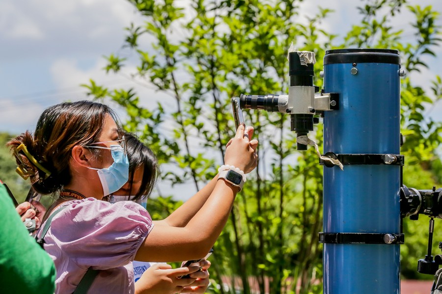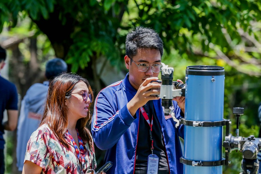 Students watch a partial solar eclipse through a telescope at the University of the Philippines in Quezon City, the Philippines on April 20, 2023. (Xinhua/Rouelle Umali)