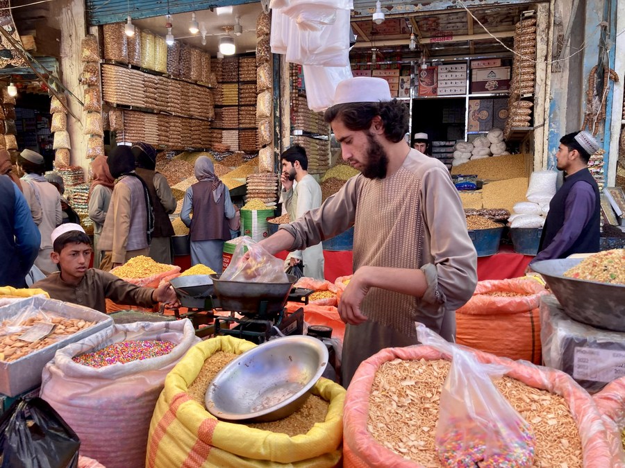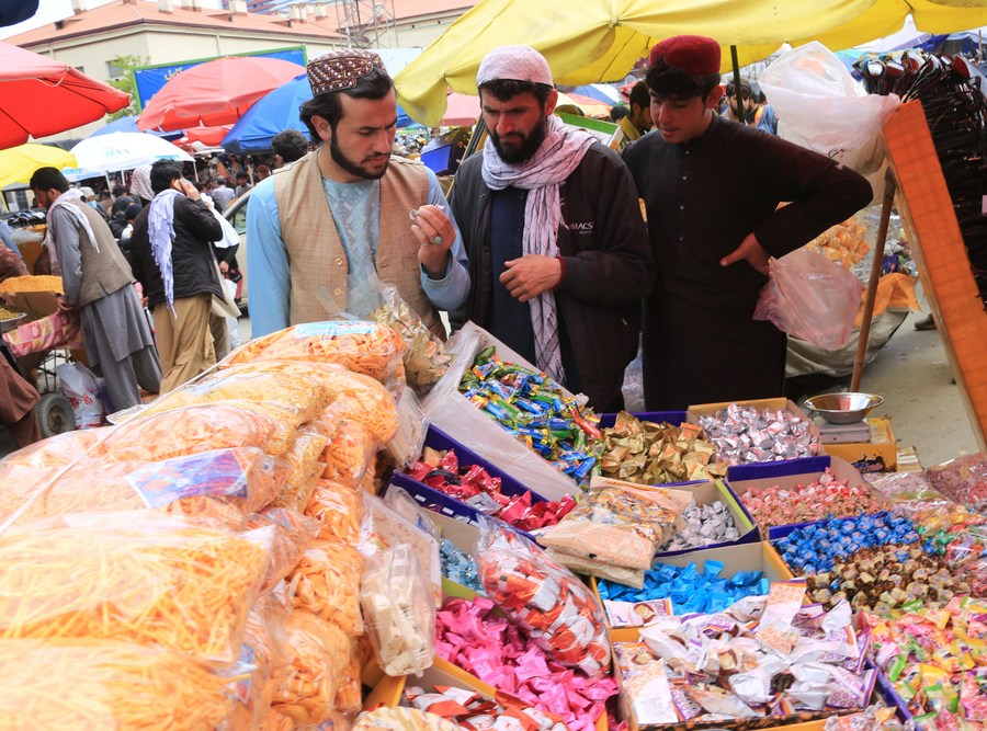 Afghan people buy sweets at a market ahead of Eid al-Fitr, in Kabul, Afghanistan, April 18, 2023. (Photo by Saifurahman Safi/Xinhua)