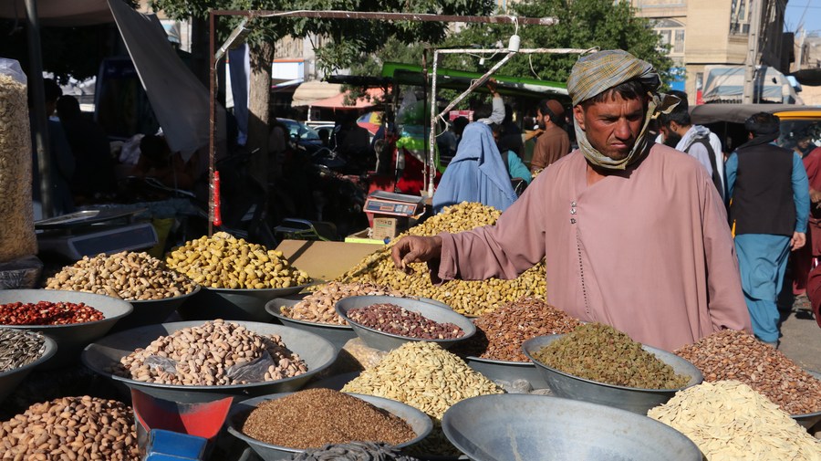A local vendor sells dried fruits and nuts at a local market ahead of Eid al -Fitr festival in Kandahar province, Afghanistan, on April 20, 2023. (Photo by Arghand/Xinhua)