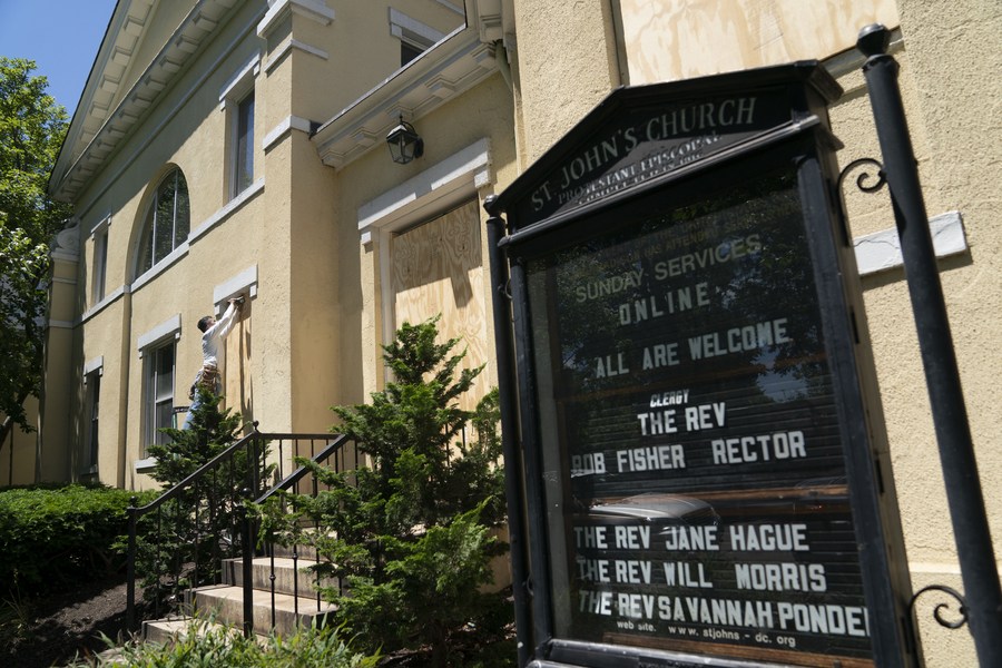 A man boards up a window of St. John's Episcopal Church in Washington D.C., the United States, on June 1, 2020. (Xinhua/Liu Jie)