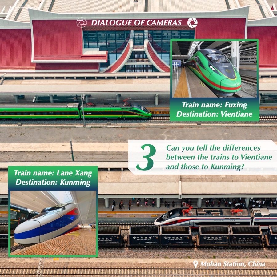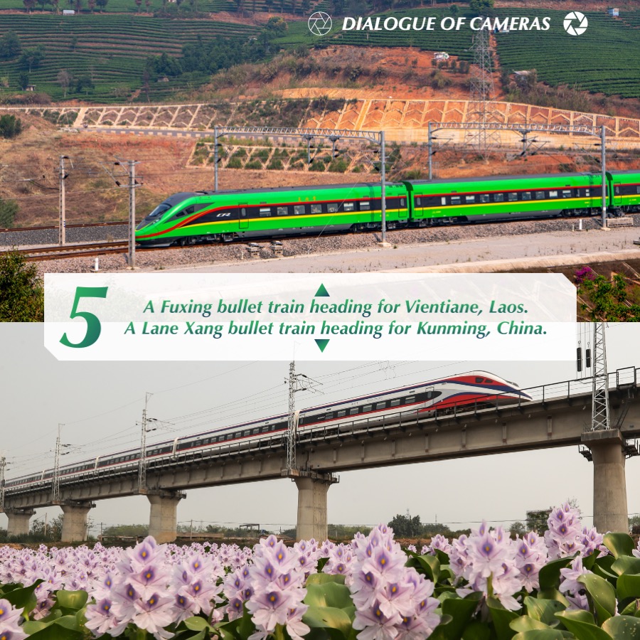 "Fuxing" and "Lane Xang" are the names of bullet trains departing from China and Laos, respectively. Despite sharing the same technical specifications, they have different appearances.