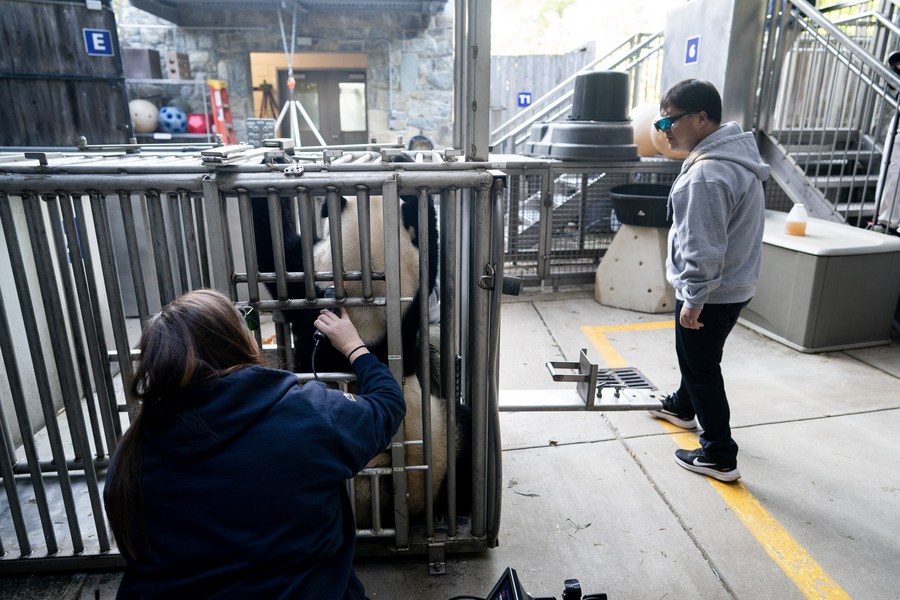 Giant panda Mei Xiang receives a cold-laser treatment at Smithsonian's National Zoo in Washington, D.C., the United States, April 19, 2023. (Xinhua/Liu Jie)