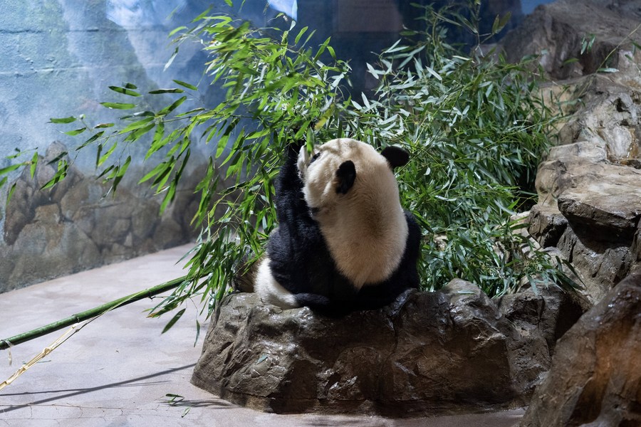 This photo taken on April 19, 2023 shows giant panda Xiao Qi Ji at Smithsonian's National Zoo in Washington, D.C., the United States. (Xinhua/Liu Jie)