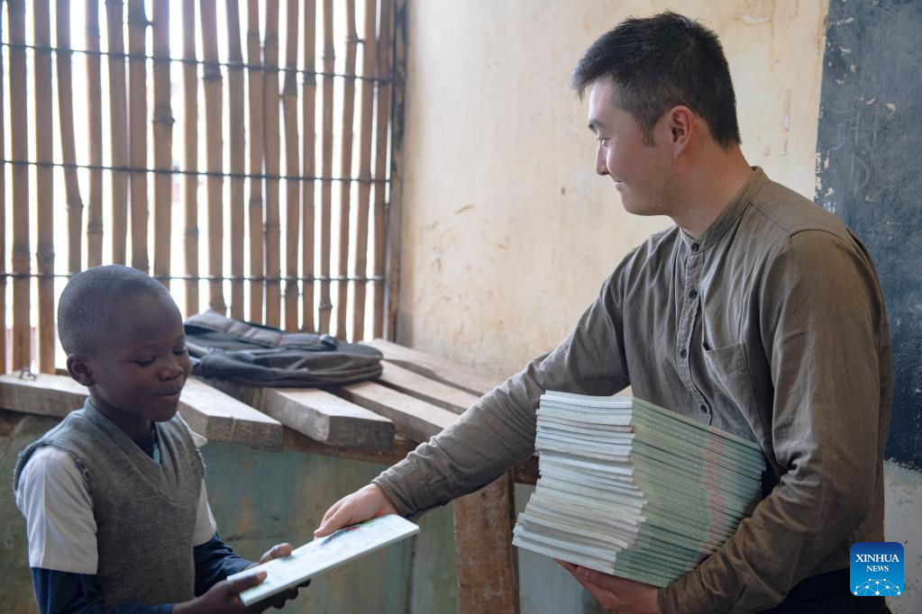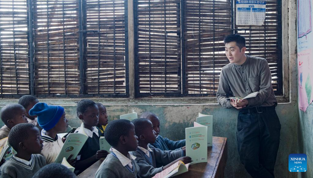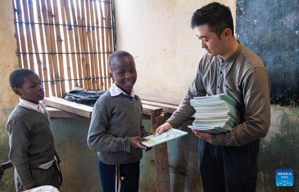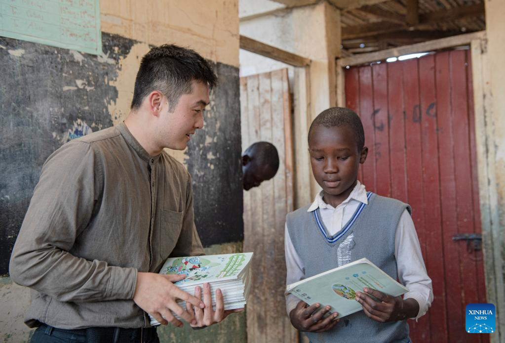 Liu Yimenghan passes a book to a student at Dream Building Service Association (DBSA) School in Mathare Valley of Nairobi, Kenya, April 19, 2023.