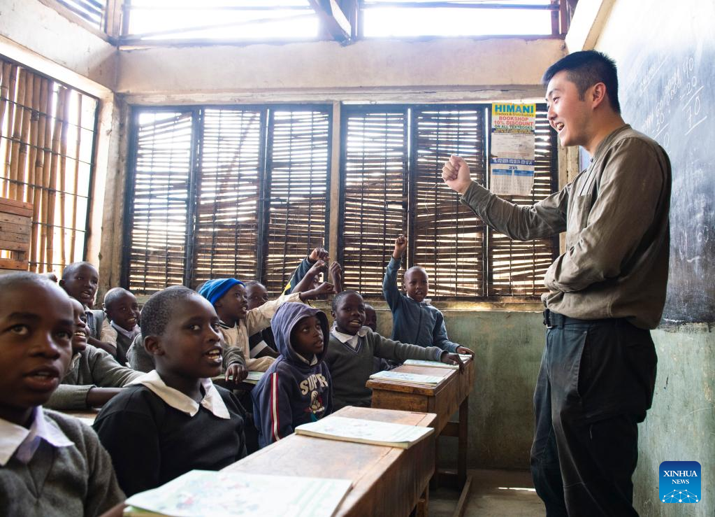 Liu Yimenghan cheers students up at Dream Building Service Association (DBSA) School in Mathare Valley of Nairobi, Kenya, April 19, 2023.
