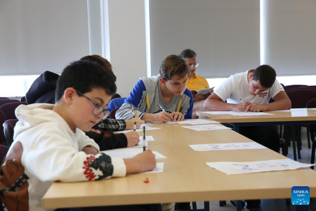 Students write Chinese characters during a Chinese character writing competition for secondary schools in Kirkop, Malta, on April 22, 2023. Malta celebrated United Nations Chinese Language Day by hosting its first-ever Chinese character writing competition for secondary schools on Saturday. (Xinhua/Chen Wenxian)