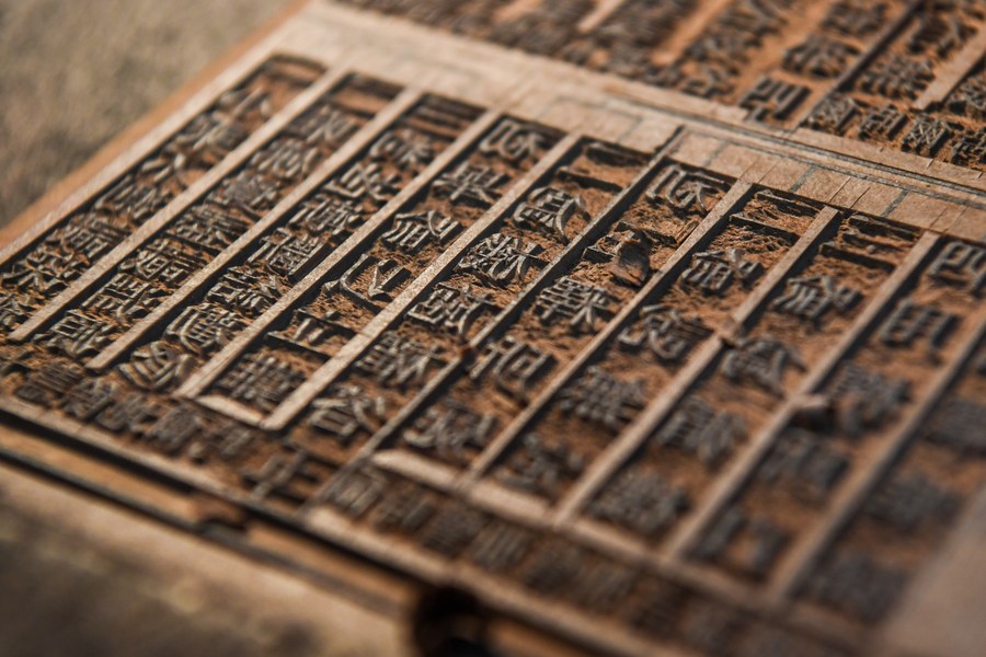 Photo taken on April 15, 2022 shows an engraved printing block containing Chinese characters in Nanjing, east China's Jiangsu Province. (Xinhua/Li Bo)