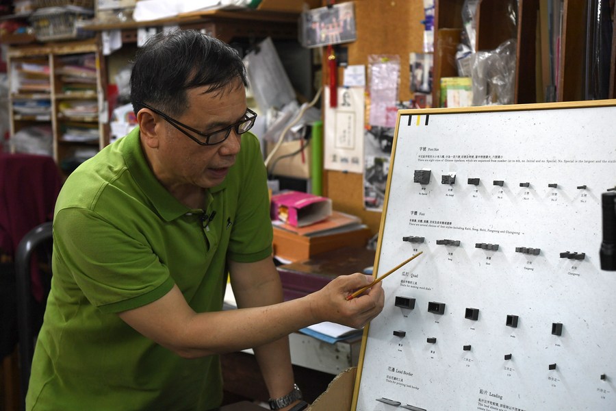 Photo taken on March 27, 2023 shows Yam Wai-sang presenting the letterpress printing technique and tools in Hong Kong, China. (Xinhua/Chen Duo)