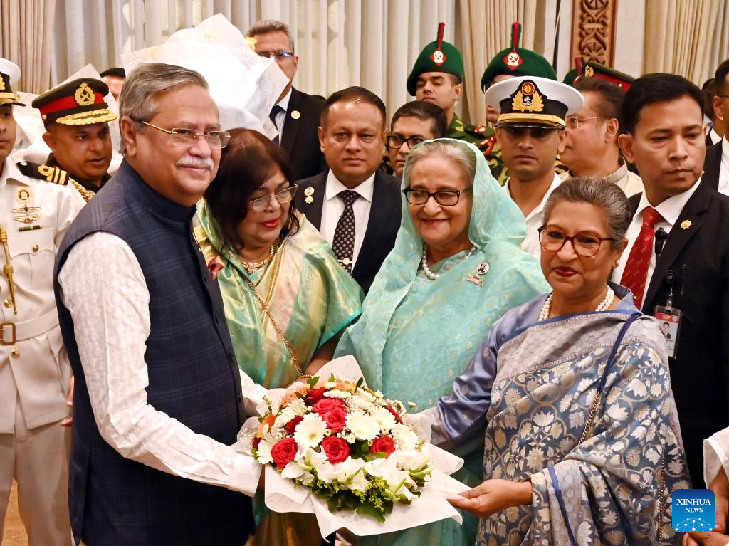 Bangladeshi President Mohammed Shahabuddin Chuppu (1st L, Front) is greeted by Bangladeshi Prime Minister Sheikh Hasina (2nd R, Front) in Dhaka, Bangladesh, on April 24, 2023. Mohammed Shahabuddin Chuppu, a retired judge and former commissioner of the Anti-Corruption Commission, took the oath as the 22nd president of Bangladesh Monday, with parliament speaker Shirin Sharmin Chaudhury administering the oath of office to Shahabuddin. (PID/Handout via Xinhua)