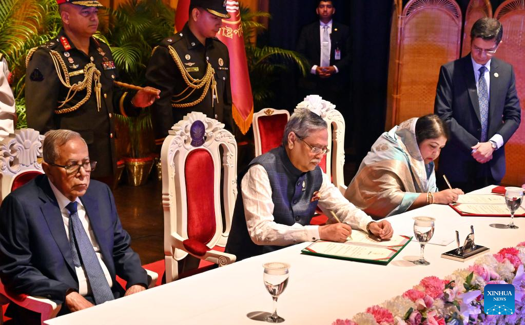 Bangladeshi President Mohammed Shahabuddin Chuppu (2nd L, Front) and Bangladeshi Parliament Speaker Shirin Sharmin Chaudhury (3rd L, Front) sign documents during the new president's oath-taking ceremony in Dhaka, Bangladesh, on April 24, 2023. Mohammed Shahabuddin Chuppu, a retired judge and former commissioner of the Anti-Corruption Commission, took the oath as the 22nd president of Bangladesh Monday, with parliament speaker Shirin Sharmin Chaudhury administering the oath of office to Shahabuddin. (PID/Handout via Xinhua)