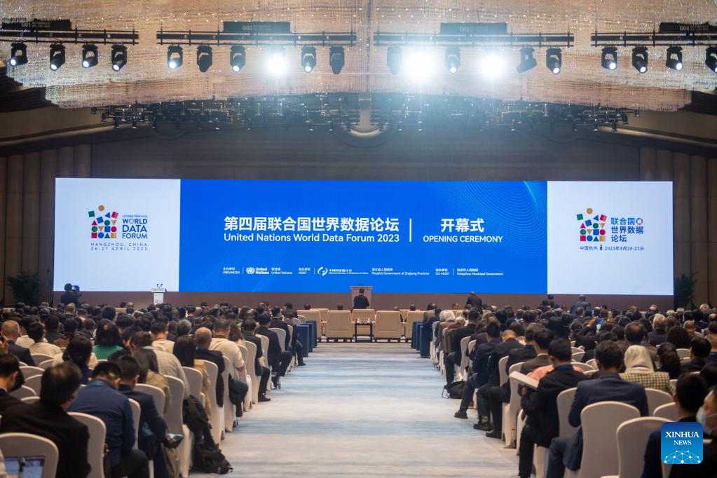 This photo taken on April 24, 2023 shows a view of the opening ceremony of the 4th United Nations World Data Forum in Hangzhou, capital of east China's Zhejiang Province. The forum is scheduled from April 24 to 27. (Xinhua/Jiang Han)