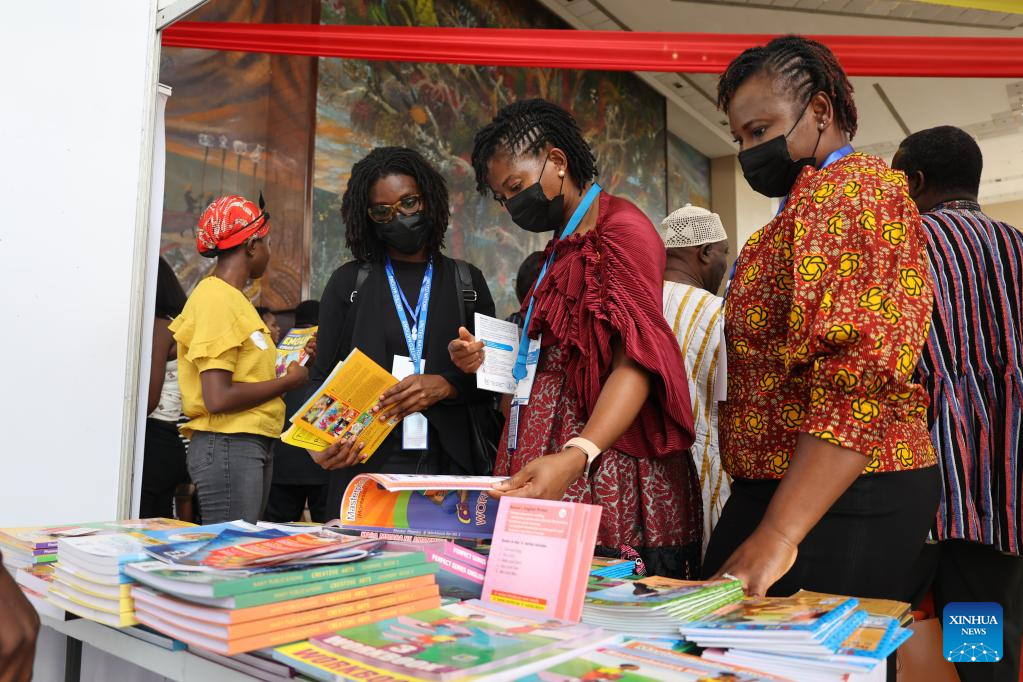 People read books at a book exhibition in Accra, Ghana, April 24, 2023. The Ghanaian capital Accra formally took over as the 2023 World Book Capital of the United Nations Educational, Scientific and Cultural Organization (UNESCO) from the Mexican city of Guadalajara on Monday. (Photo by Seth/Xinhua)