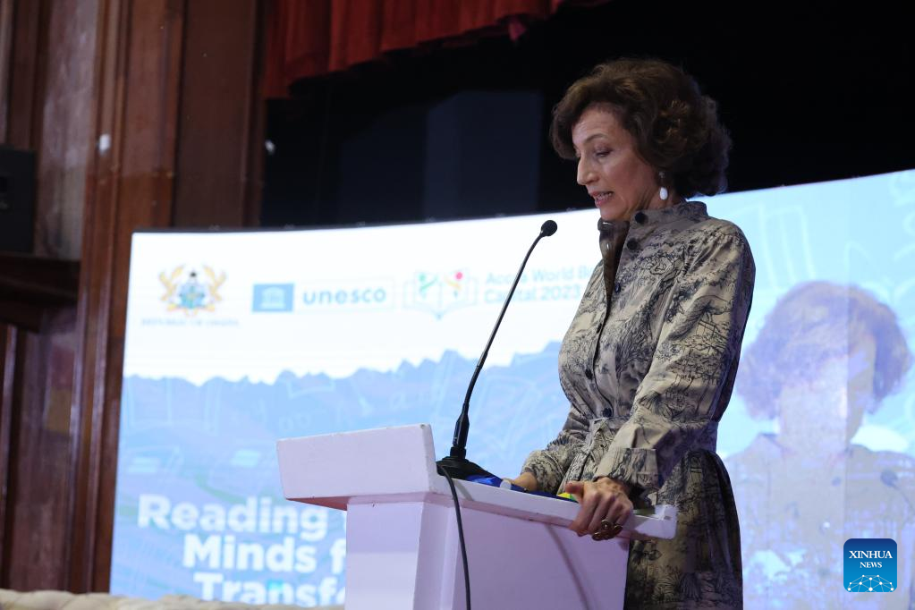 Director-General of UNESCO Audrey Azoulay delivers a speech at the launching ceremony for the 2023 World Book Capital in Accra, Ghana, April 24, 2023. The Ghanaian capital Accra formally took over as the 2023 World Book Capital of the United Nations Educational, Scientific and Cultural Organization (UNESCO) from the Mexican city of Guadalajara on Monday. (Photo by Seth/Xinhua)