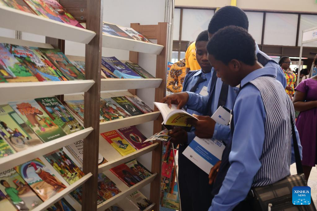 Students read books at a book exhibition in Accra, Ghana, April 24, 2023. The Ghanaian capital Accra formally took over as the 2023 World Book Capital of the United Nations Educational, Scientific and Cultural Organization (UNESCO) from the Mexican city of Guadalajara on Monday. (Photo by Seth/Xinhua)