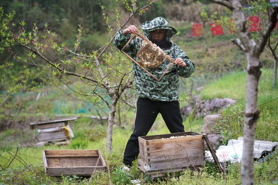 Wu Zhulin, Party branch secretary of Gangbei Village, checks a beehive in Gangbei Village of Jing'an County, east China's Jiangxi Province, April 6, 2023. (Xinhua/Wan Xiang)
