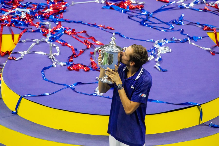 Daniil Medvedev of Russia kisses the trophy after the men's singles final against Novak Djokovic of Serbia at the 2021 US Open in New York on Sept. 12, 2021. (Photo by Michael Nagle/Xinhua)