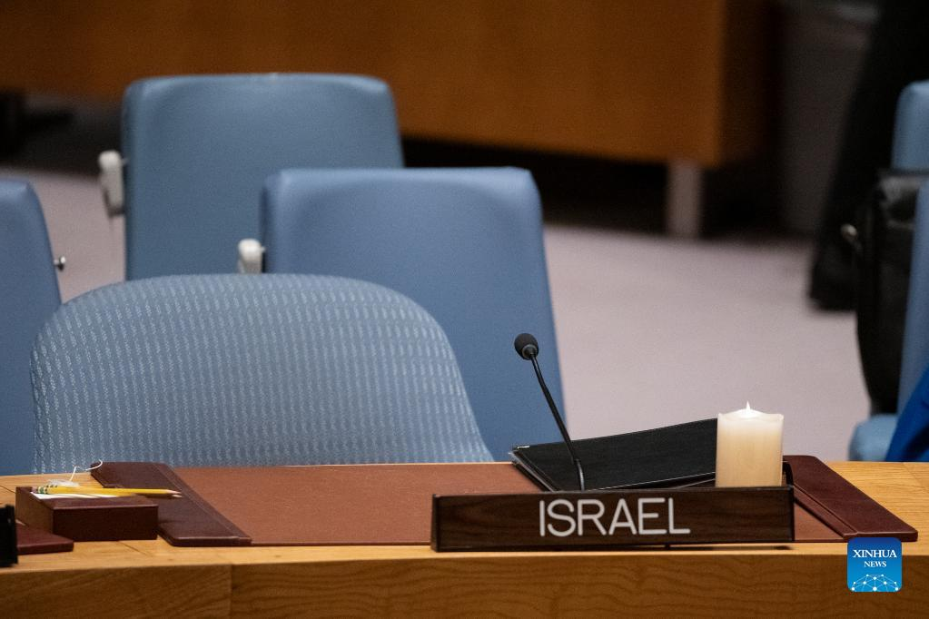 The seats of the Israeli delegation are seen empty after Israeli ambassador to the United Nations Gilad Erdan and other members of the delegation walked out of the Security Council chamber in protest during a Security Council debate on the Middle East, including the Palestinian question, at the UN headquarters in New York, on April 25, 2023. Israel's ambassador to the United Nations, Gilad Erdan, on Tuesday walked out of a Security Council meeting in protest. (Evan Schneider/UN Photo/Handout via Xinhua)