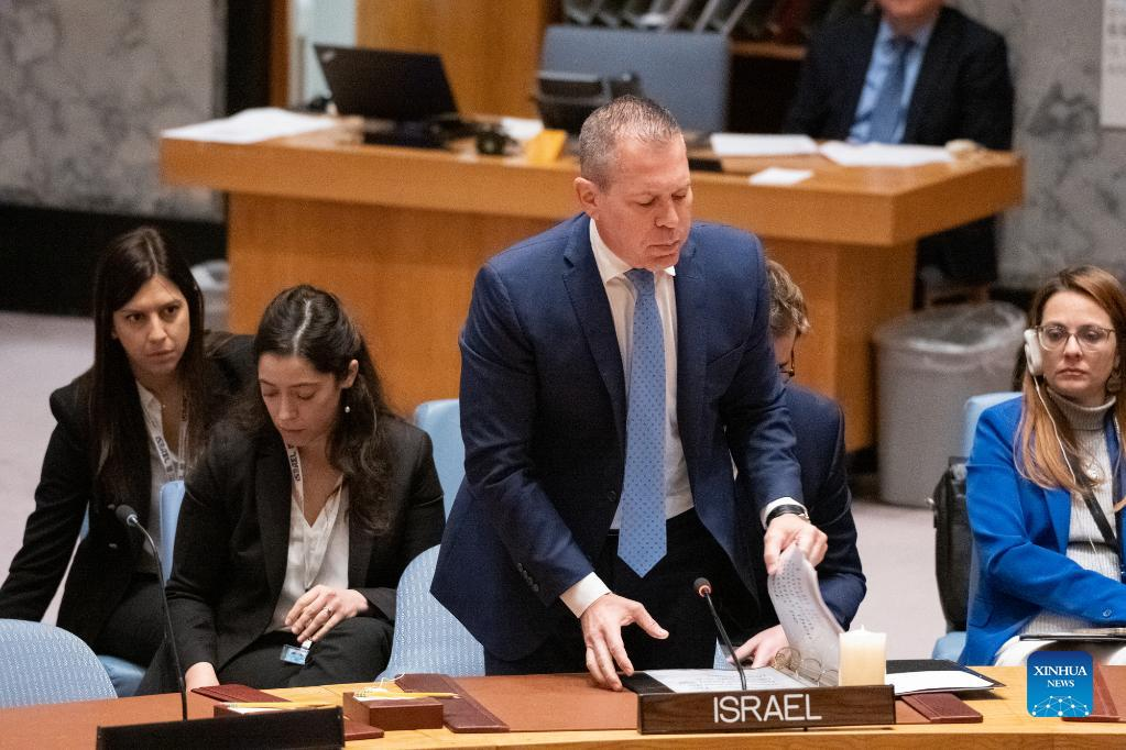 UNITED NATIONS, April 25 (Xinhua) -- Israel's ambassador to the United Nations, Gilad Erdan, on Tuesday walked out of a Security Council meeting in protest.