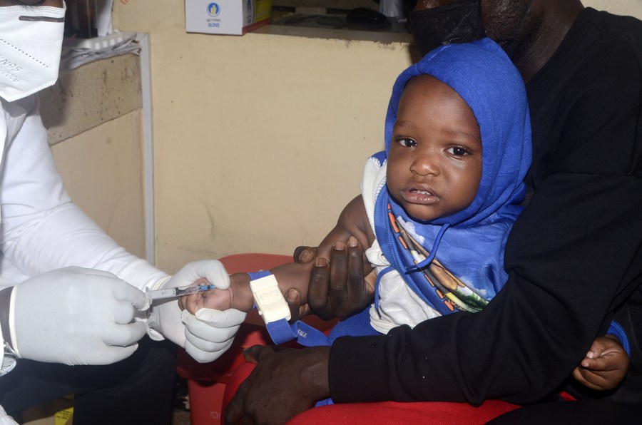 The file photo shows a health worker collecting blood sample from a child during a one-day malaria health camp in Kampala, Uganda, on April 25, 2022. (Photo by Nicholas Kajoba/Xinhua)