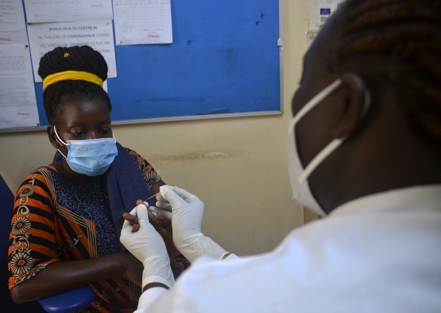 The file photo shows a health worker performing a rapid diagnostic test during a one-day malaria health camp in Kampala, Uganda, on April 26, 2021. (Photo by Nicholas Kajoba/Xinhua)