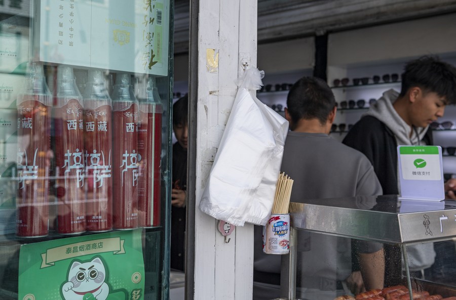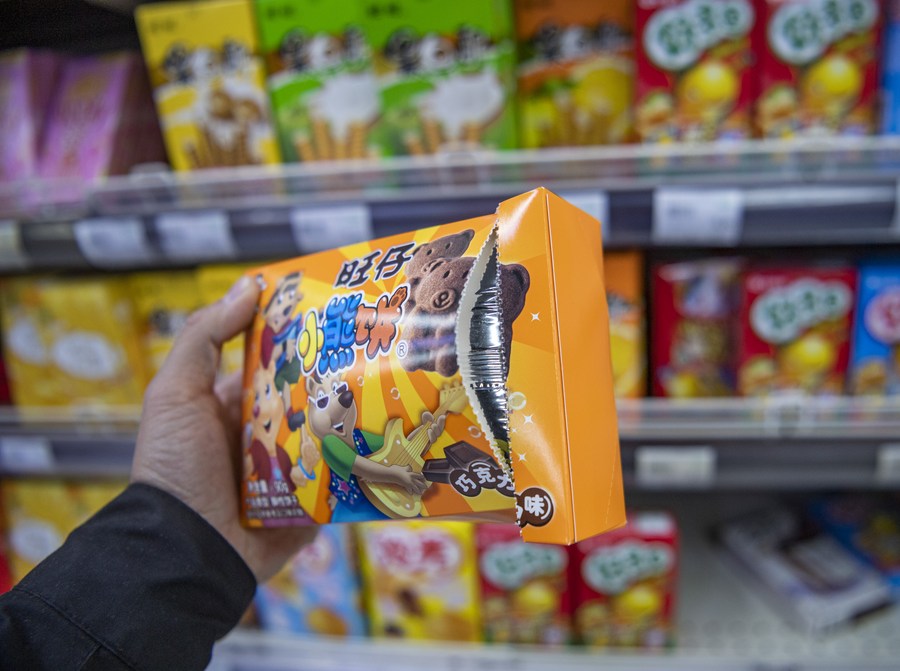 This photo taken on April 27, 2023 shows a bulging bag of snack in Lhasa, capital of southwest China's Tibet Autonomous Region. (Xinhua/Sun Fei)