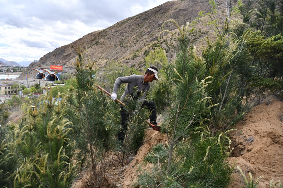 A man plants trees on a mountain in Lhasa, capital of southwest China's Tibet Autonomous Region, May 7, 2022. (Xinhua/Jigme Dorje)