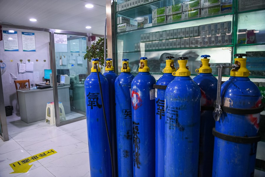 This photo taken on April 27, 2023 shows medical oxygen cylinders at a clinic in Lhasa, capital of southwest China's Tibet Autonomous Region. (Xinhua/Sun Fei)
