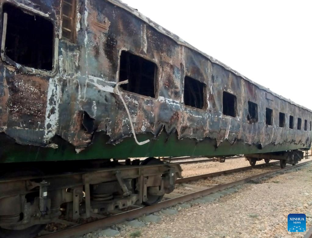This photo taken with mobile phone shows a burnt train in Sukkur, south Pakistan, April 27, 2023. Two people were killed and four others went missing after a passenger train caught fire in Pakistan's southern Sindh province in the wee hours of Thursday morning, the Pakistan Railways said in a statement. (Str/Xinhua)