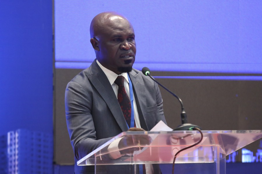 Fortunatus Mhambe, director of export promotion with the Tanzania Trade Development Authority (TanTrade), speaks at a one-day China-Tanzania Economic and Trade Conference at the Julius Nyerere International Convention Center in Dar es Salaam, Tanzania, April 25, 2023. (Photo by Herman Emmanuel/Xinhua)