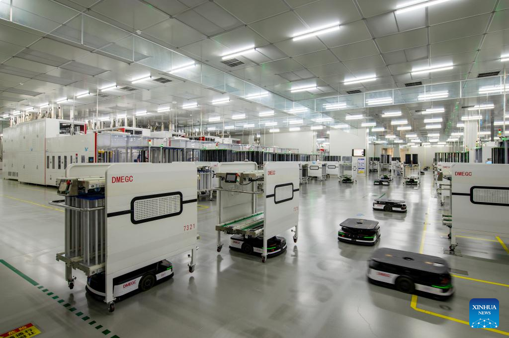 Automatic guided vehicles work in a factory of Hengdian Group DMEGC Magnetics in Dongyang, east China's Zhejiang Province, April 27, 2023.