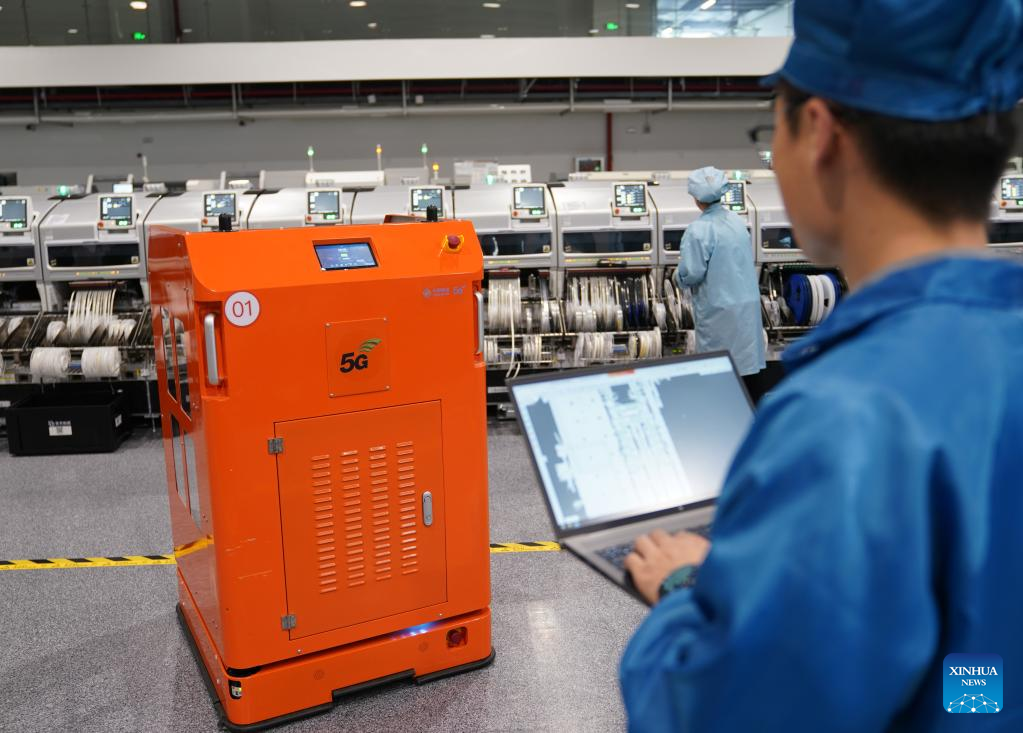 A technician checks an automatic guided vehicle at a factory of Unisplendour Co., Ltd. in Xiaoshan District of Hangzhou, east China's Zhejiang Province, April 27, 2023.