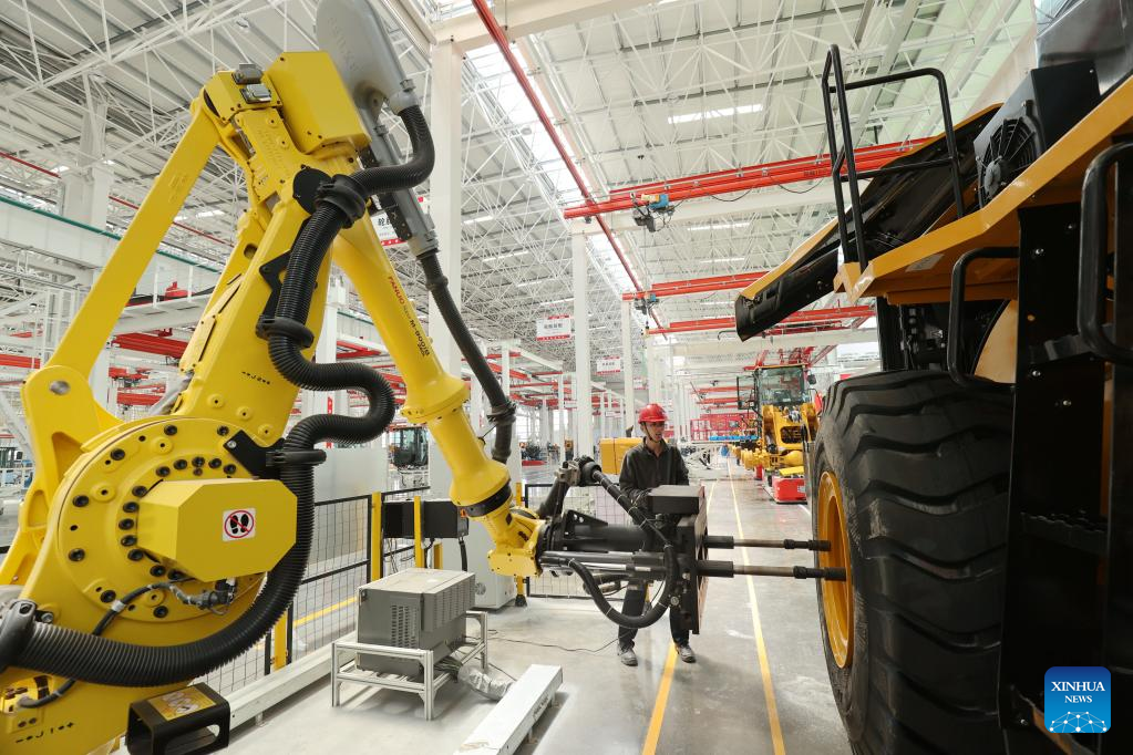 Technicians check a production line at a loader production base of Sany Group in Huzhou, east China's Zhejiang Province, April 27, 2023.