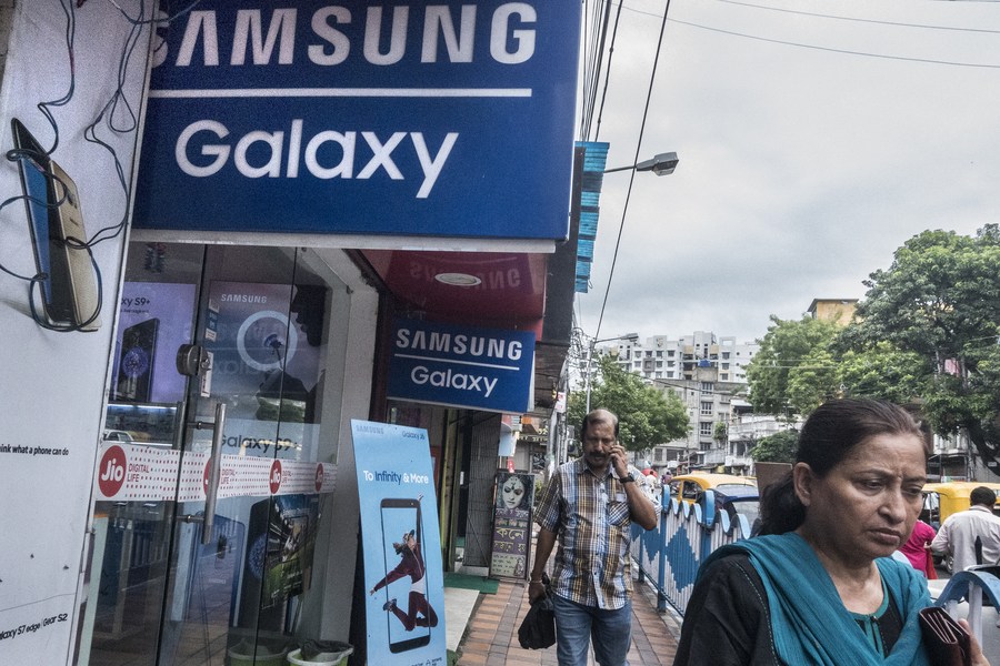 Commuters walk in front of a Samsung mobile store in Kolkata, India, on July 10, 2018. (Xinhua/Tumpa Mondal)