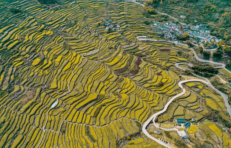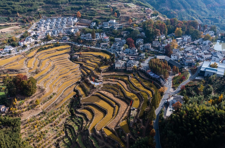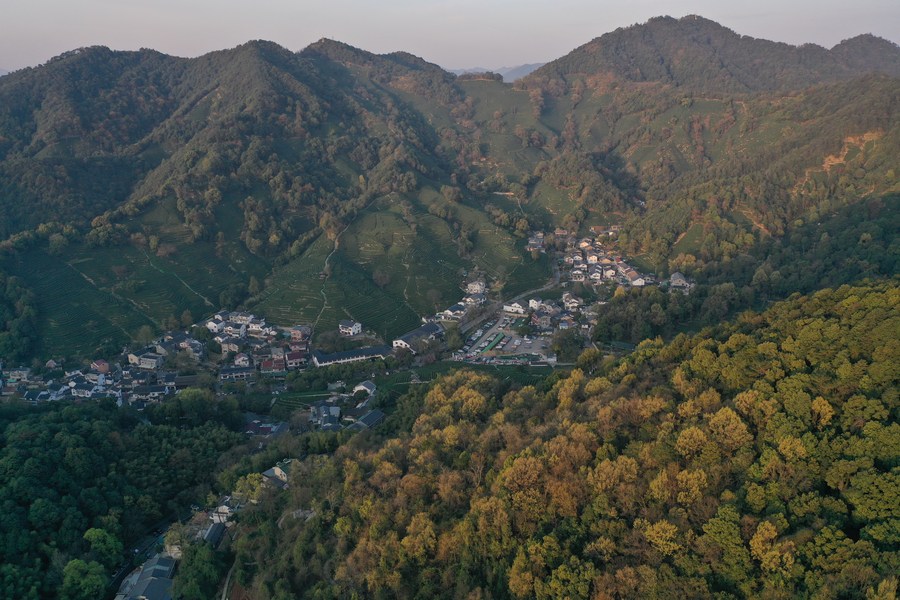 This aerial photo taken on Nov. 5, 2022 shows the autumn scenery of Zhinan Village in Lin'an District of Hangzhou City, east China's Zhejiang Province. (Xinhua/Xu Yu)