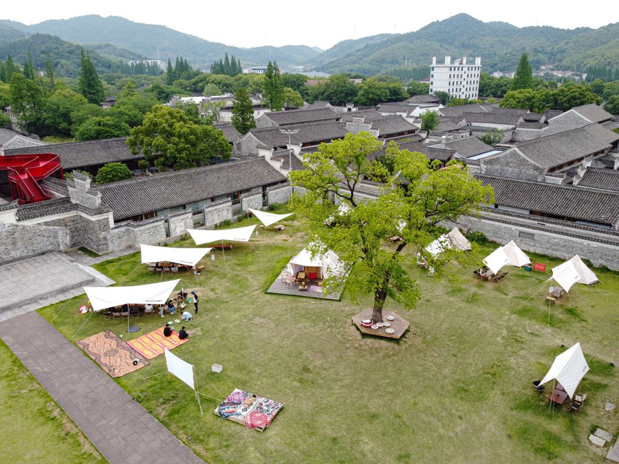 This aerial photo taken on May 19, 2022 shows a camping site in Cicheng Town of Jiangbei District of Ningbo City, east China's Zhejiang Province. (Xinhua/Jiang Han)