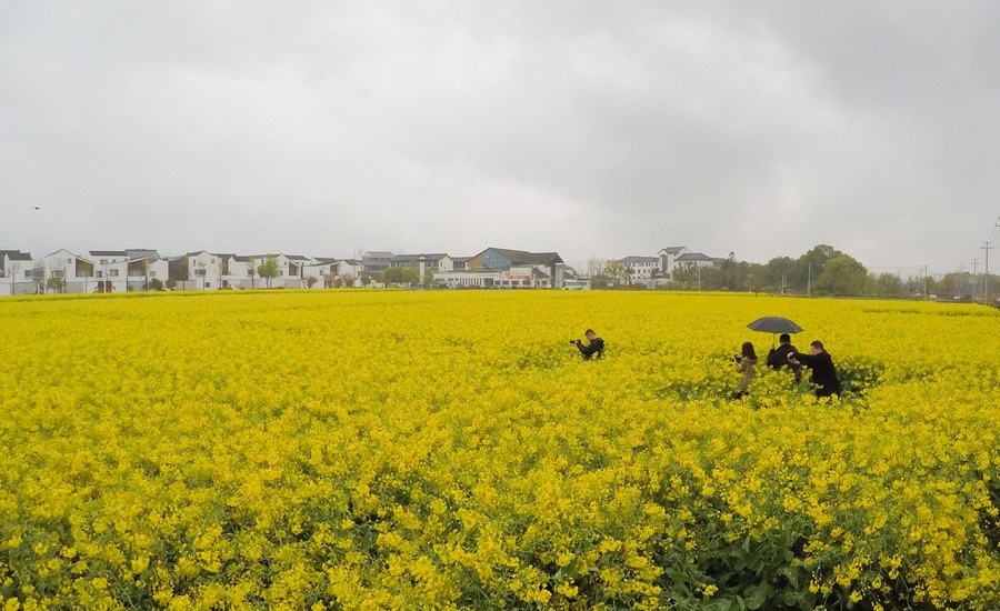 Tourists take photos in a cole flower field in Fuyang District of Hangzhou City, east China's Zhejiang Province, March 30, 2023. (Xinhua/Weng Xinyang)