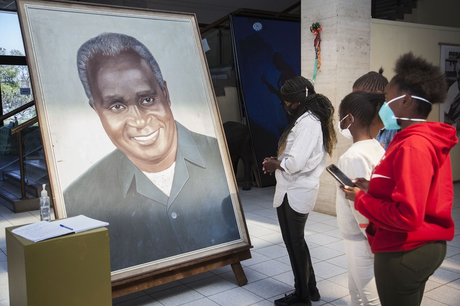 The file photo shows people visiting an exhibition on the legacy of Kenneth Kaunda in Lusaka, Zambia, on July 10, 2021. (Photo by Martin Mbangweta/Xinhua)